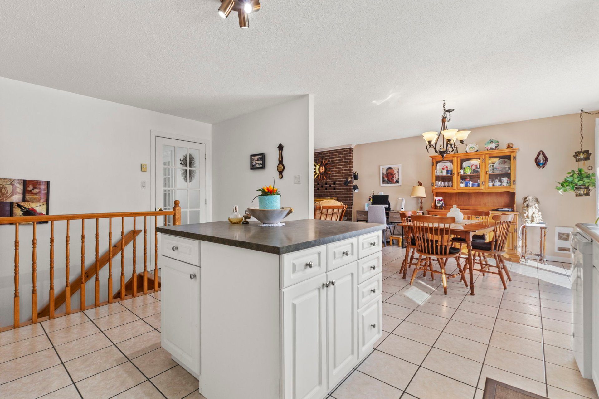 Le salon propose une ambiance chaleureuse grâce à son foyer au bois, parfait pour les soirées en famille. La cuisine fonctionnelle est dotée d'un îlot central offrant un bel espace de préparation et de rangement, et s'ouvre sur une grande salle à manger conviviale, idéale pour recevoir. Une porte patio donne accès à une grande terrasse arrière, permettant de profiter pleinement de la cour.