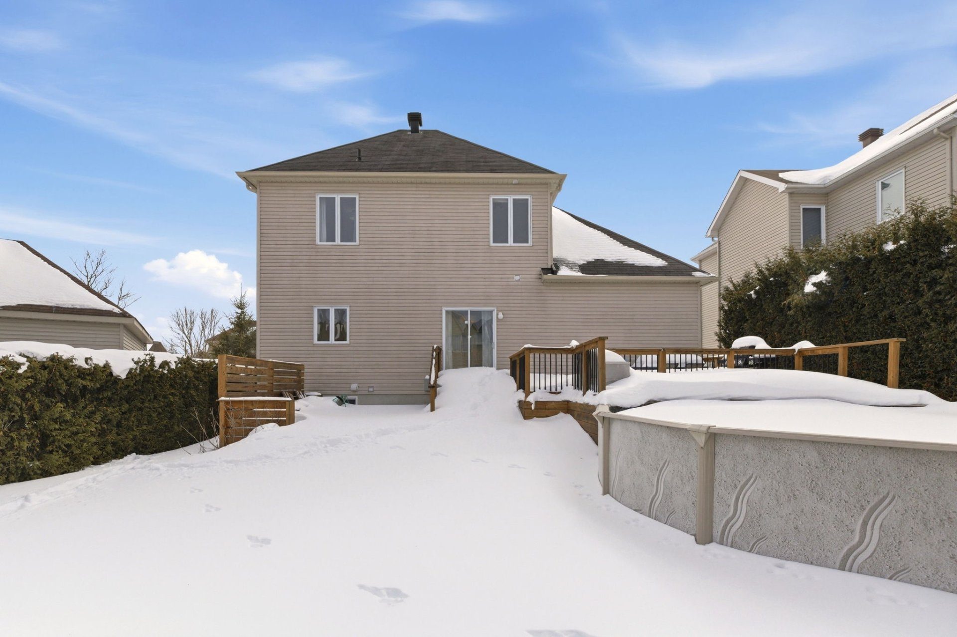 À l'extérieur, profitez d'une cour entièrement clôturée offrant intimité et sécurité. L'immense patio en bois traité sur trois paliers (36 x 14 pi) constitue un véritable espace de vie extérieur, parfait pour les réceptions estivales. La piscine hors terre de 18 pi complète cet environnement idéal pour profiter pleinement de la belle saison.