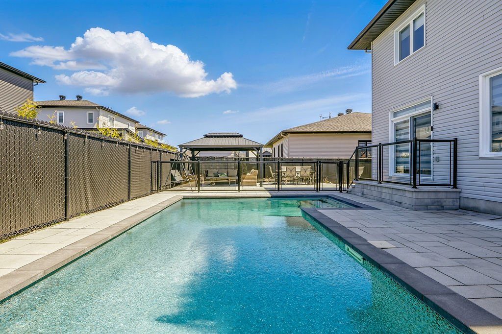 Piscine creusée chauffée au sel, clôturée pour plus de sécurité.