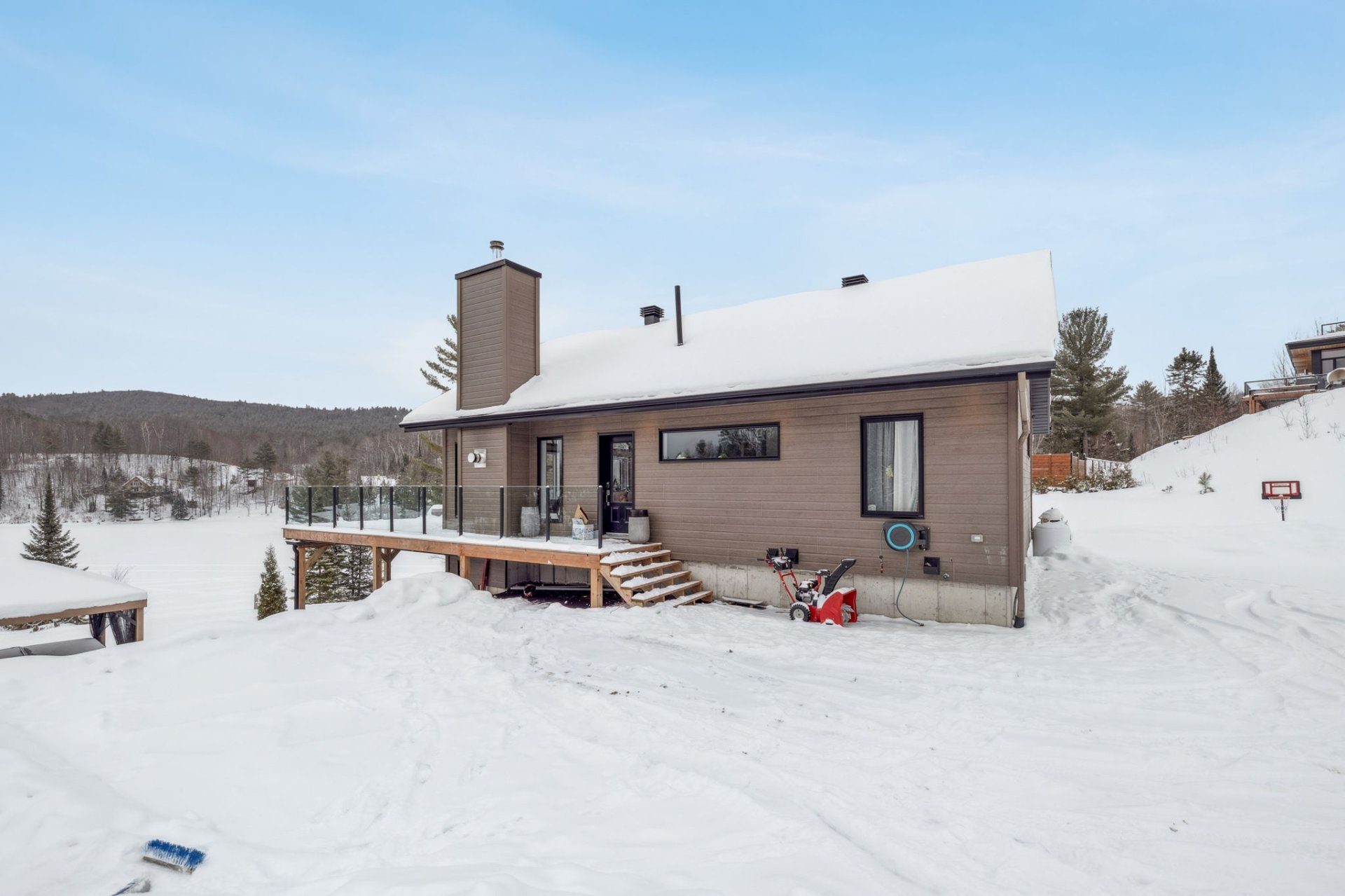 L'intérieur, lumineux et élégant, met en valeur un plafond cathédrale avec poutres apparentes et une fenestration généreuse, offrant des vues spectaculaires sur le lac et les montagnes. La cuisine ouverte avec comptoir lunch s'intègre parfaitement à l'aire de vie principale.