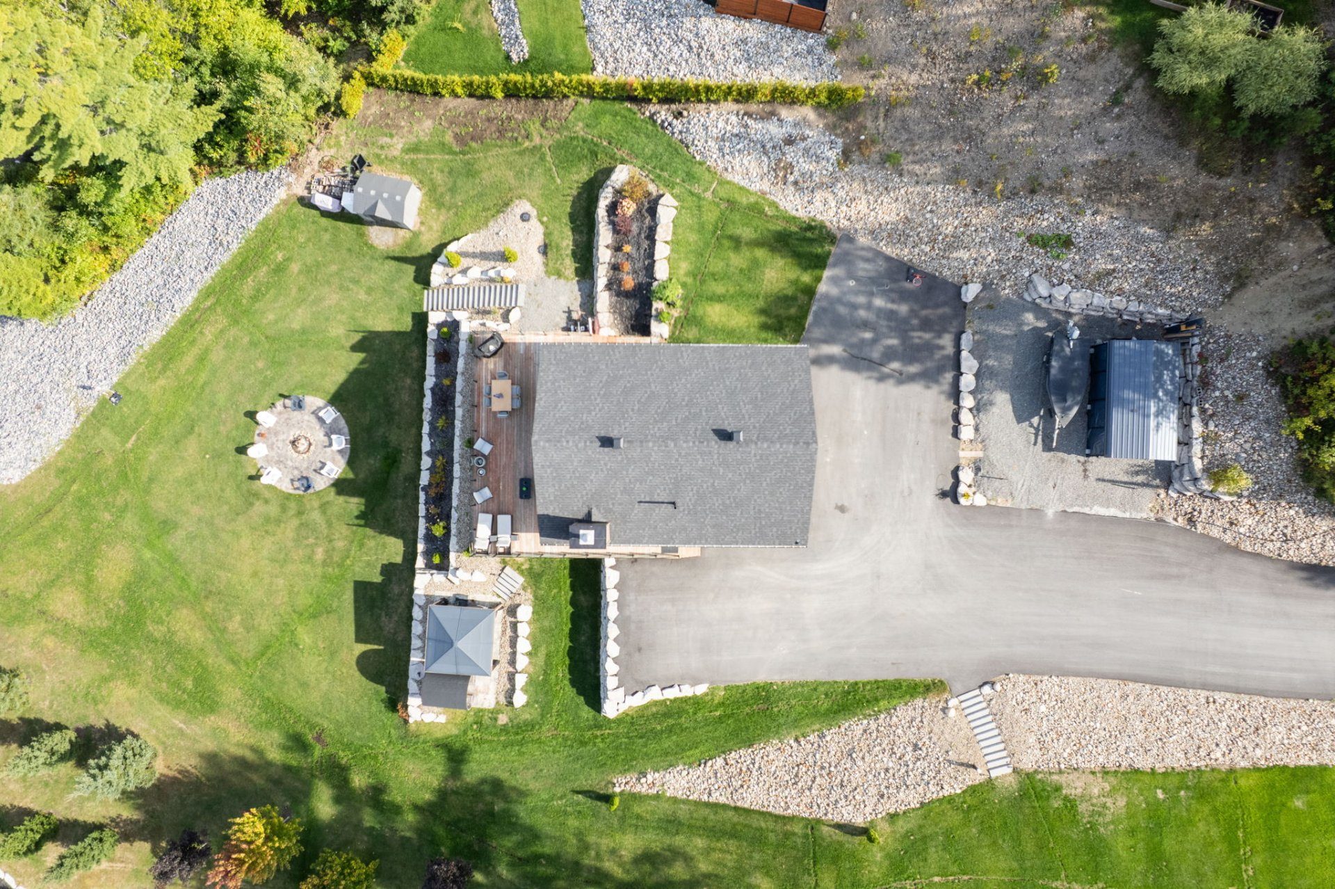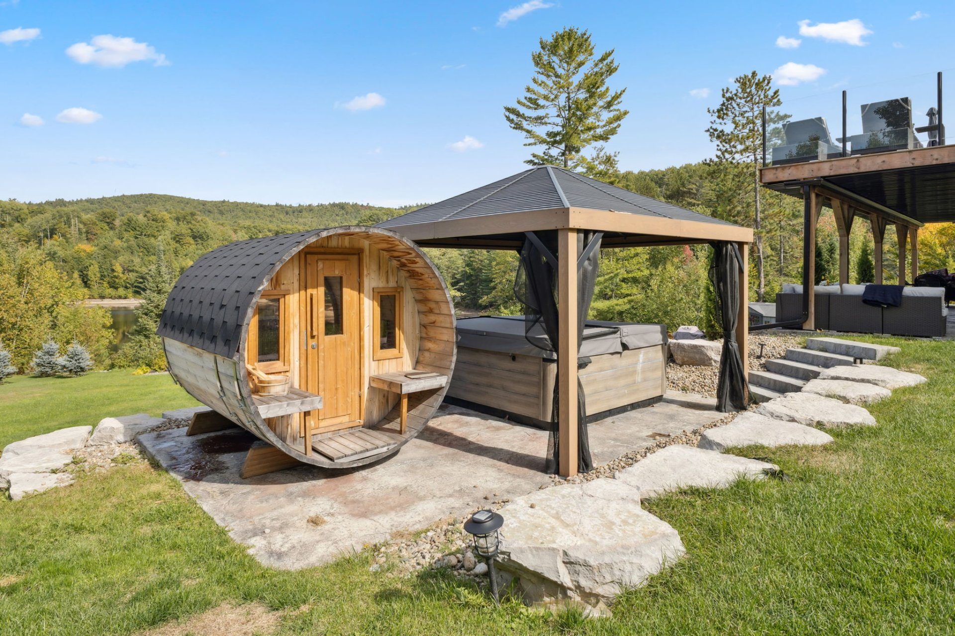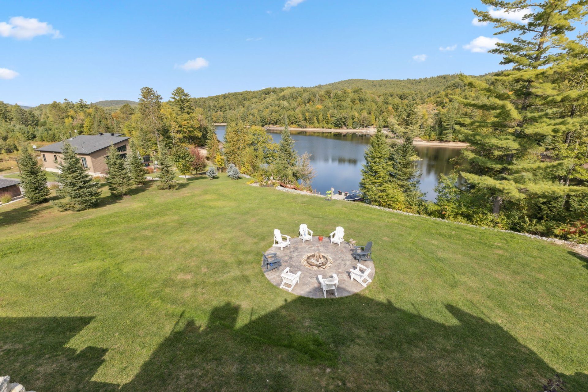 Sur un terrain d'environ un acre, découvrez un espace digne d'un resort privé : plage intime, spa et sauna pour une détente absolue, ainsi qu'un espace feu pour des soirées mémorables sous les étoiles.